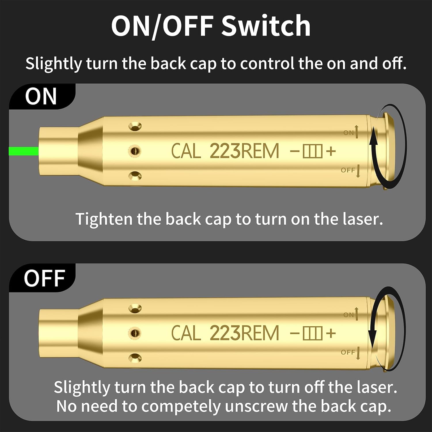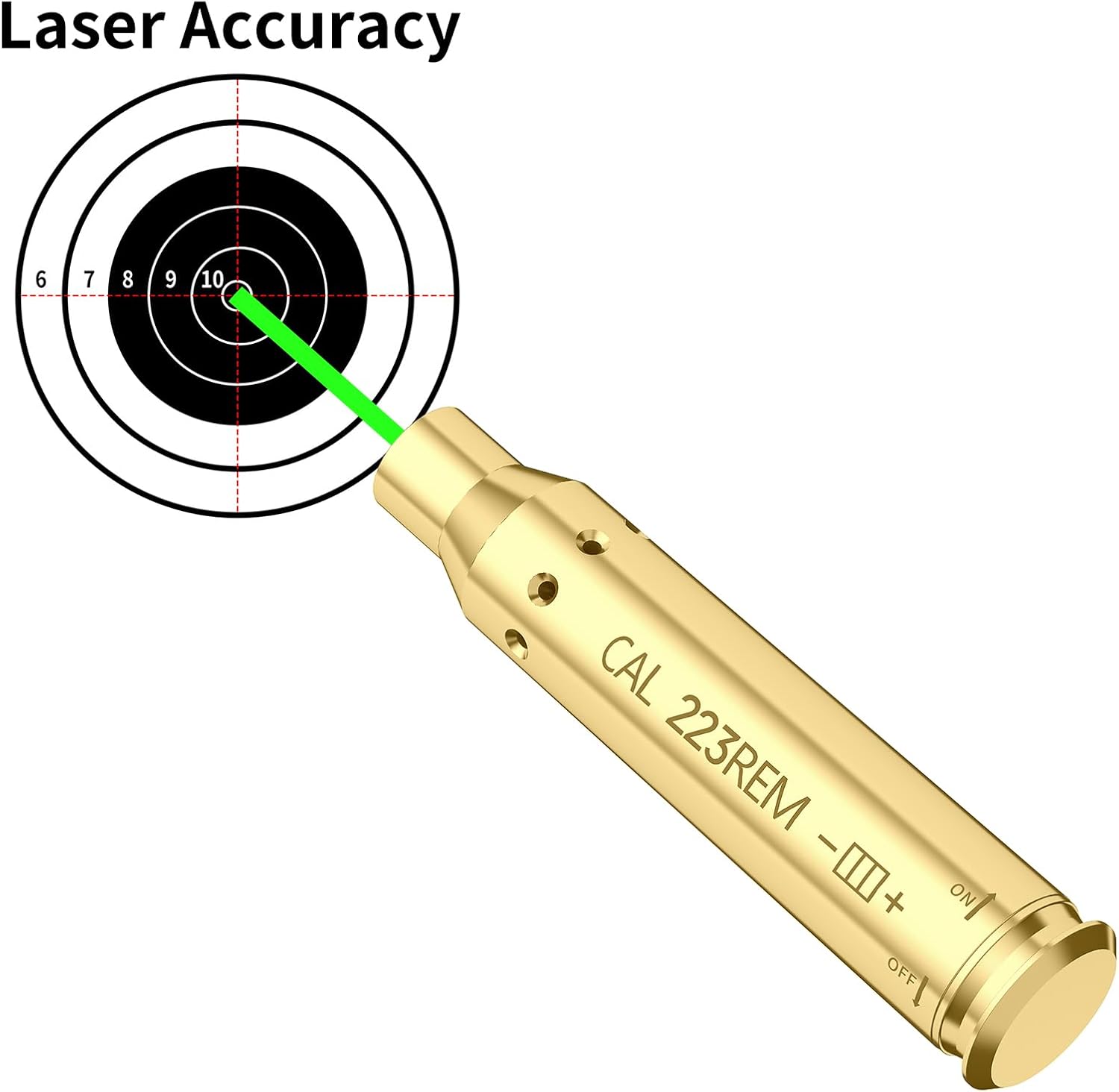 Specifications: Power: Class IIIA laser, less than 5mW Material: Brass Max.Output Power: <5mW Sighting Range: 15 to 100 yards Batteries: 12 x LR41 Batteries (EXTRA SET INCLUDED! ) Features: With On/Off Function Package included 1 X 223 Bore Sight 12 X LR41 batteries