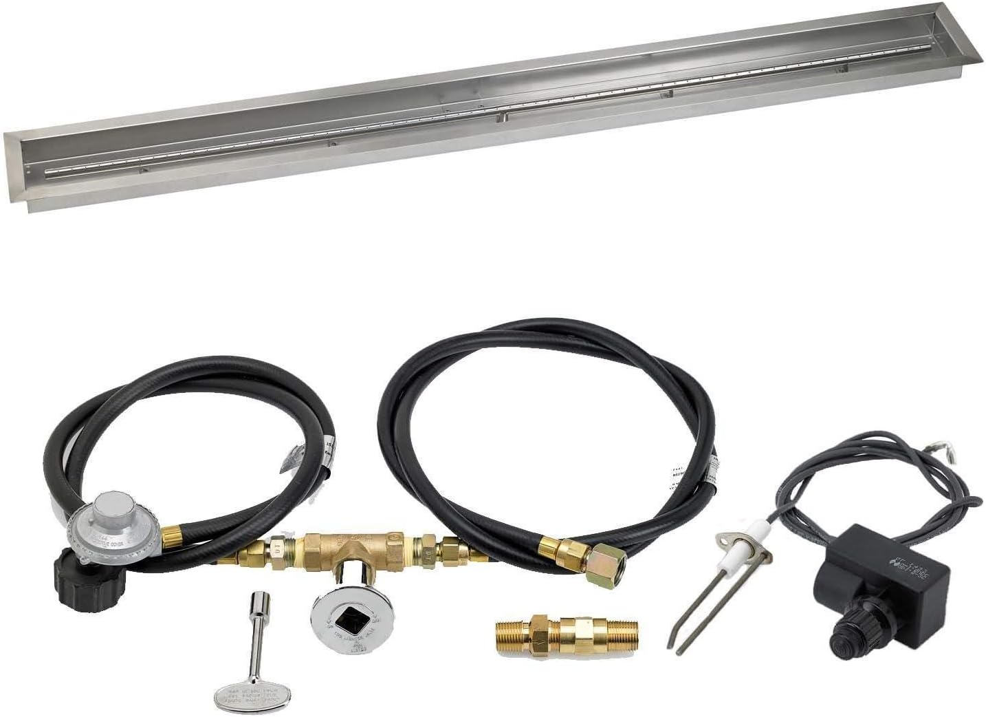 The 72 x 6 inches Spark Ignition Fire Pit Kit with Linear Trough Pan from American Fire Glass offers a high-quality gas fire pit kit to complete your DIY fire pit project. The high-quality 304 stainless steel construction of the fire pit burner ensures a long-lasting durability designed to stand up to the elements outdoors, while the 68-inch fire ring is rated for 125,000 BTU to provide a bright and beautiful flame. The drilled burner ports are designed to reduce any whistling noise while the included spark igniter, stainless steel flex line, and shut-off valve with regulator provide the necessary components to connect to your gas source. The 72 x 6-inch Linear Trough pan features the same 304 stainless steel construction for the same quality while integrated weep holes assist with water drainage to keep your components in great shape. The 2-inch deep bowl pan features a 1.25-inch lip around the top that's designed to drop into your custom fire pit enclosure and provide a tray for the fire pit media to create a one-of-a-kind gas fire feature - perfect for your patio.