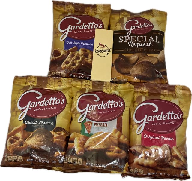 Package includes 5 varieties of Gardettos Chips Pretzel Deli Style Mustard | Special Request | Chipotle Cheddar | Pizzeria | Original Recipe