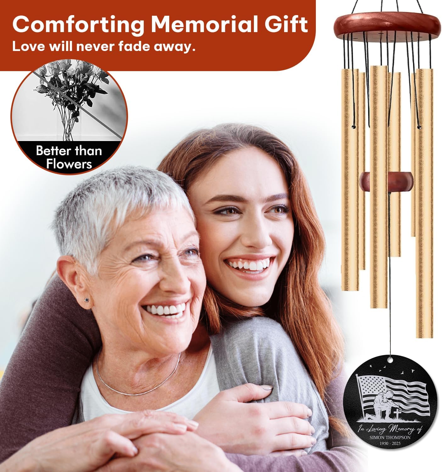 Pay tribute to a true hero with this Personalized Veteran Memorial Wind Chime, a heartfelt symbol of courage, service, and eternal honor. Crafted to commemorate the lives of those who served with pride, this chime blends strength, sentiment, and melody into one meaningful keepsake.The circular hanging disc features a soldier kneeling beside a grave under the American flag, surrounded by birds in flight — representing freedom, peace, and eternal remembrance. This design captures the profound connection between love, sacrifice, and country, offering comfort to families and friends.Each wind chime is crafted from durable steel with a solid wood top, ensuring long-lasting quality. The precision-tuned tubes produce soothing, harmonic tones that echo with every passing breeze, creating a peaceful atmosphere that honors those who served.Personalize it with your hero’s name and years (e.g., Simon Thompson 1950–2025). The engraving is laser-etched directly onto the metal for a permanent, weatherproof finish — a tribute built to last as long as the memory it represents.This veteran memorial wind chime makes a meaningful sympathy gift for military families, providing comfort and reflection on special occasions such as Memorial Day, Veterans Day, or anniversaries of remembrance. Suitable for both indoor and outdoor spaces, it stands as a powerful symbol of gratitude and peace.Let its gentle melody remind you that while your hero may be gone, their courage, love, and legacy still resonate — carried softly through every note of the wind.