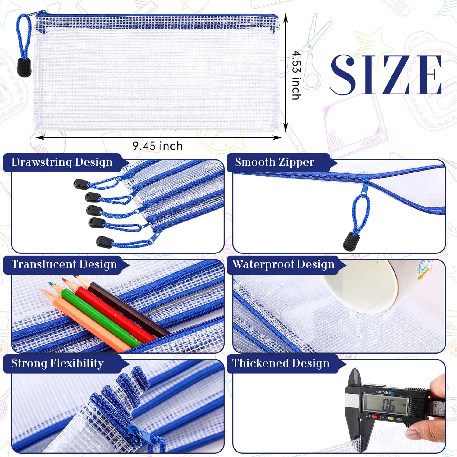 Features: <Suitable for most people: Our multipurpose document bags have delicate and convenient design, in line with most people's aesthetic, look stylish, and they are suitable for most people to use. Considerate presents: If you have friends who need some A6 mesh bags with zipper in the daily life, you can give them ours, they will like these gifts and get convenience in using. Specifications: Material: PVC Color: blue, white Size: approx. 24 x 11.5 cm/ 9.45 x 4.53 inches Package includes: 120 x Mesh zipper pouches Notes: Manual measurement, please allow slight errors on size. The color may exist slight difference due to different screen displays