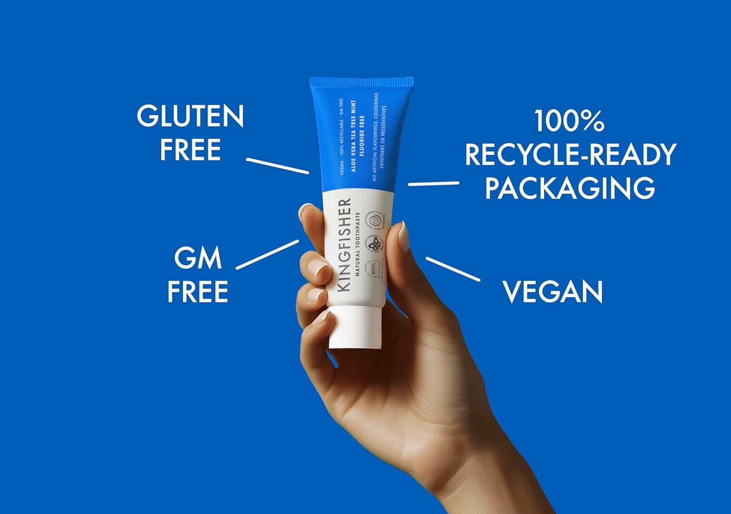 Kingfisher Natural Toothpaste is the UK's leading brand of natural toothpaste. Aloe Vera, Tea Tree & Mint Toothpaste (Fluoride Free) contains no artificial colourings, flavourings, sweeteners or preservatives. Instead, they use natural ingredients.Kingfisher was the first natural toothpaste to receive the important approval of the British Dental Health Foundation. 100ml